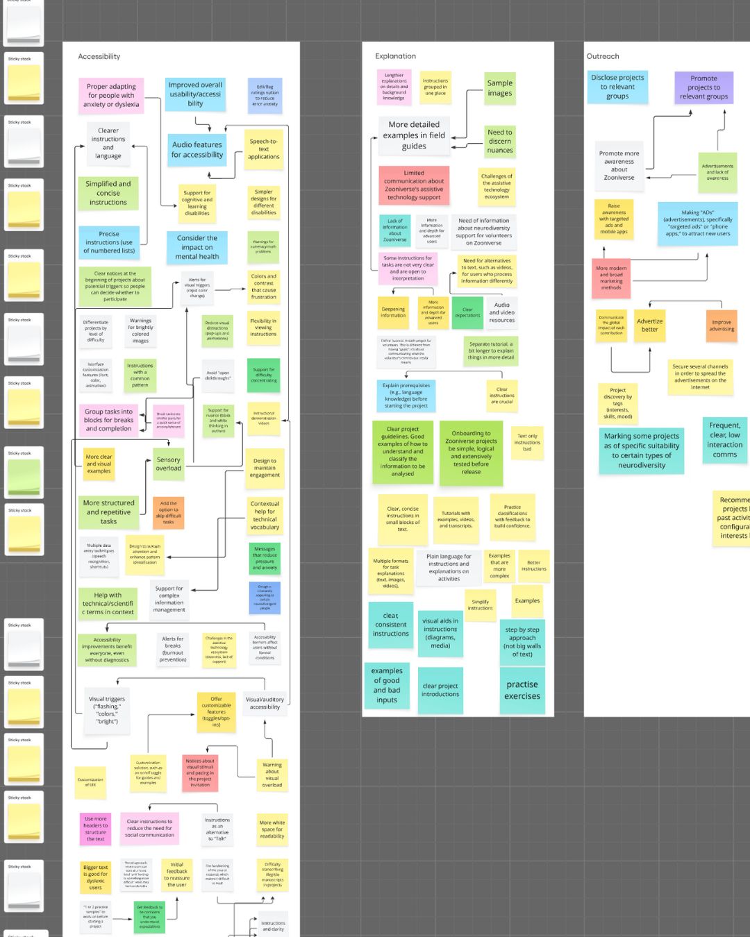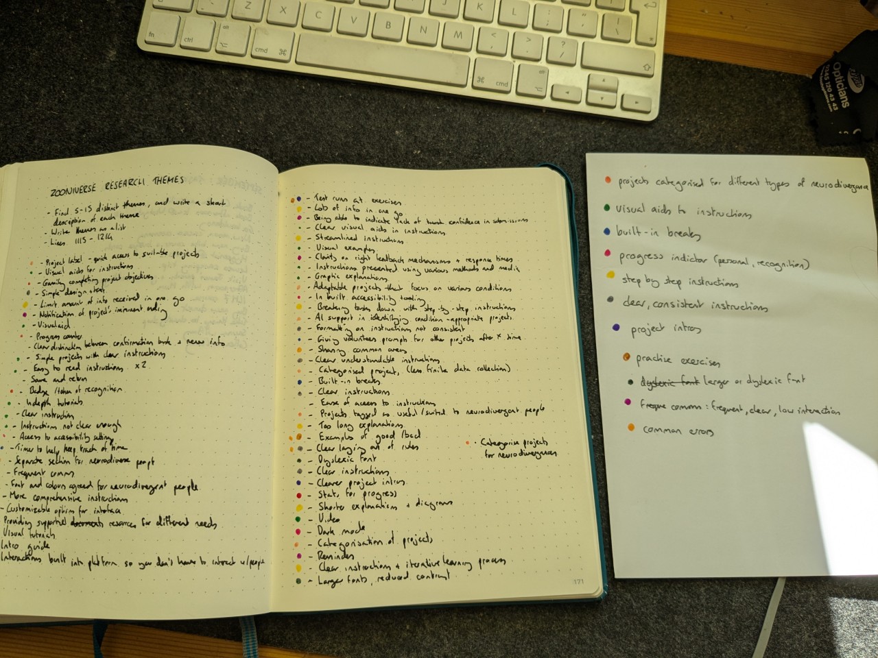 We began with an ideation session where participants brainstormed ways to make digital citizen science more neuroinclusive and shared accessibility resources and research with one another. We then used thematic analysis to organise and interpret these ideas—alongside 1,687 free-text responses from the 2024 Zooniverse large-scale neurodiversity survey—and identified distinct accessibility themes.